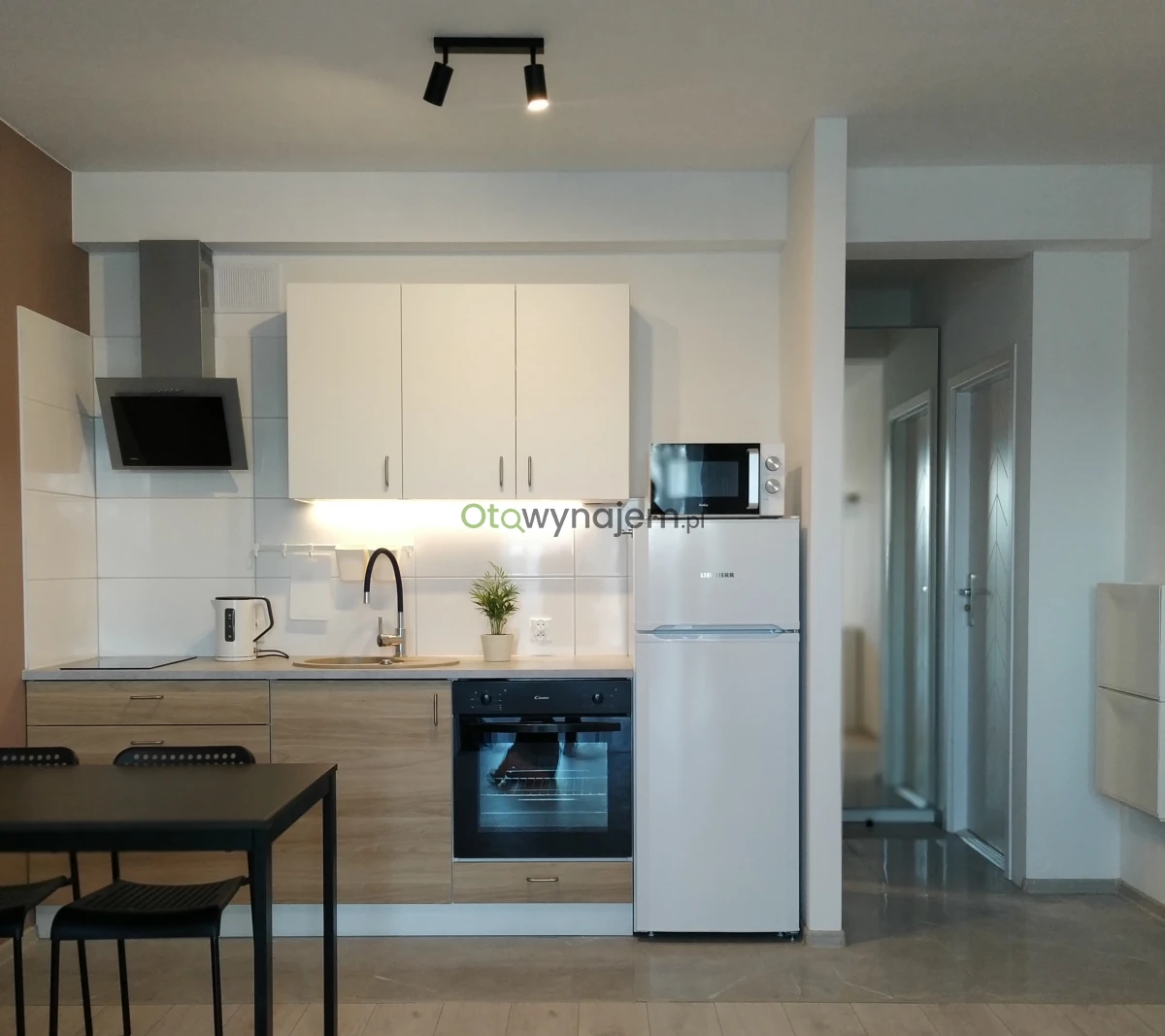 Aneks kuchenny: Płyta elektryczna, okap, piekarnik, lodówka z zamrażalnikiem, kuchenka mikrofalowa, czajnik.