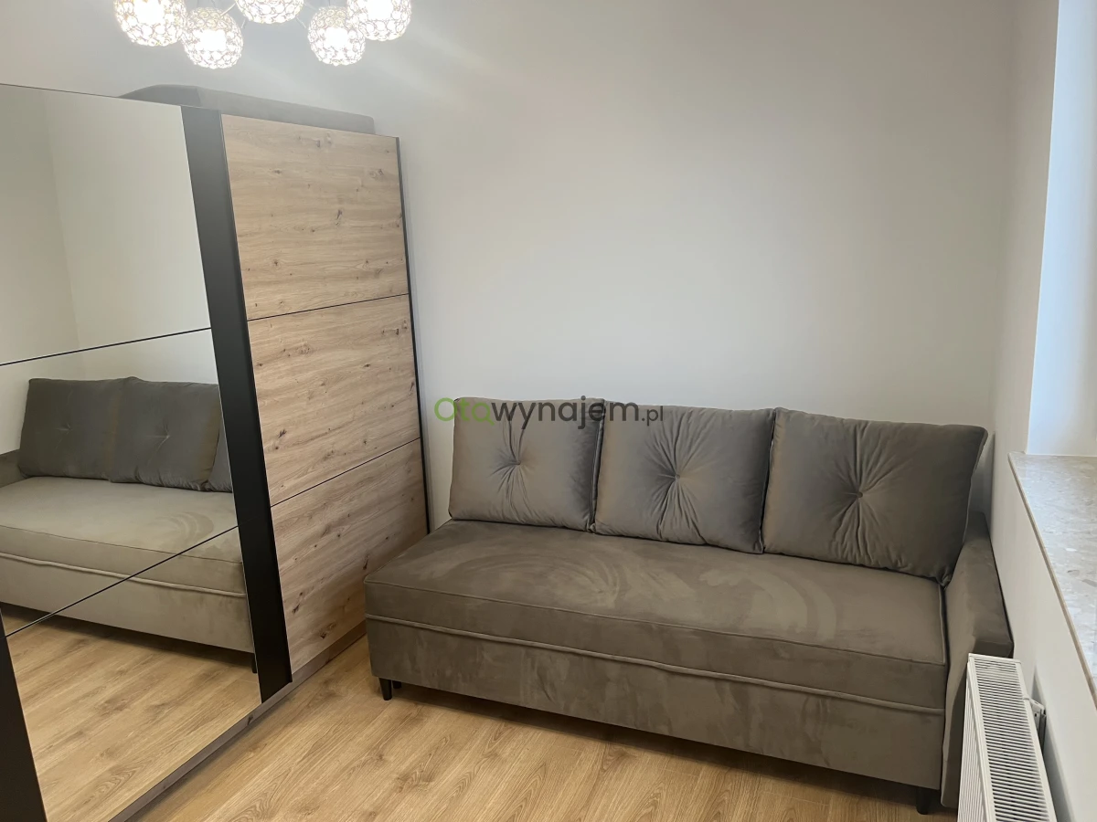W sypialni: wygodna kanapa z funkcją spania oraz duża wielofunkcyjna szafa z lustrem;